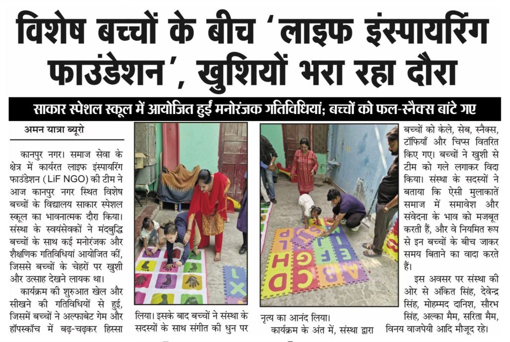 Life Inspiring Foundation (LiF NGO) рдХреА рдЯреАрдо рдХреЗ рд▓рд┐рдП рдЖрдЬ рдХрд╛ рджрд┐рди рдмреЗрд╣рдж рдЦрд╛рд╕ рд░рд╣рд╛ред рдХрд╛рдирдкреБрд░ рдирдЧрд░ рд╕реНрдерд┐рдд Sakaar Special School рдореЗрдВ рд╣рдорд╛рд░реА рдЯреАрдо рдиреЗ рджрд┐рди рдмрд┐рддрд╛рдпрд╛, рдЬрд╣рд╛рдБ рд╣рд░ рдореБрд╕реНрдХрд╛рди, рд╣рд░ рдЦреЗрд▓ рдФрд░ рд╣рд░ рдЖрд▓рд┐рдВрдЧрди рдиреЗ рд╣рдореЗрдВ рднреАрддрд░ рддрдХ рдЫреВ рд▓рд┐рдпрд╛ред