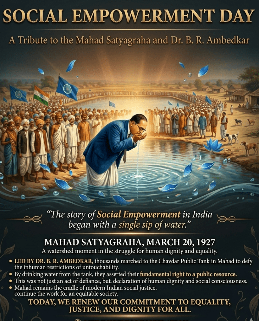 Social Empowerment Day is a tribute to the spirit of resistance and equality ignited by the Mass Mahad Satyagraha. It teaches us that even the simplest act—like drinking water—can become a powerful movement when it challenges injustice.